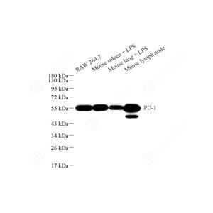 WB检测PD1蛋白(货号 GB11338). 样品: 经RIPA裂解液(货号G2002)处理的蛋白质. 封闭: 封闭: 3%脱脂牛奶(货号GC310001)溶于TBST溶液, 室温孵育1小时. —抗: 1: 1000稀释, 4℃ 孵育过夜. 二抗: HRP标记山羊抗兔IgG (H+L) (货号GB23303), 1: 5000稀释, 室温孵育1小时. |