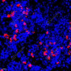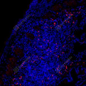 IF检测Fas Ligand蛋白(货号 GB11090-1)(红色). 样品: 大鼠脾, 4%多聚甲醛 (货号G1101) 固定12-24小时. 抗原修复: Tris-EDTA抗原修复液(pH 9.0) (G1203), 98℃, 20分钟. 封闭: 3% BSA(货号GC305010)的PBS溶液, 室温孵育30分钟. —抗: 1: 1500稀释, 4℃ 孵育过夜. 二抗: Cy3标记山羊抗兔IgG (H+L) (货号GB21303), 1: 300稀释, 室温孵育1小时. |