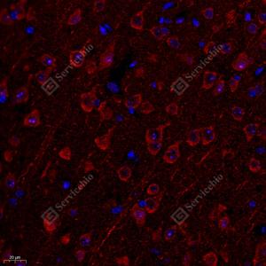 IF检测Granzyme K蛋白(货号 GB112190)(红色). 样品: 大鼠海马区, 4%多聚甲醛 (货号G1101) 固定12-24小时. 抗原修复: Tris-EDTA抗原修复液(pH 9.0) (G1203), 98℃, 20分钟. 封闭: 3% BSA(货号GC305010)的PBS溶液, 室温孵育30分钟. —抗: 1: 500稀释, 4℃ 孵育过夜. 二抗: Cy3标记山羊抗兔IgG (H+L) (货号GB21303), 1: 300稀释, 室温孵育1小时. |