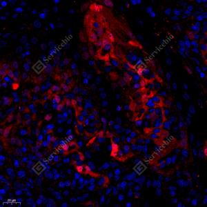 IF检测Granzyme K蛋白(货号 GB112190)(红色). 样品: 人扁桃体, 4%多聚甲醛 (货号G1101) 固定12-24小时. 抗原修复: Tris-EDTA抗原修复液(pH 9.0) (G1203), 98℃, 20分钟. 封闭: 3% BSA(货号GC305010)的PBS溶液, 室温孵育30分钟. —抗: 1: 500稀释, 4℃ 孵育过夜. 二抗: Cy3标记山羊抗兔IgG (H+L) (货号GB21303), 1: 300稀释, 室温孵育1小时. |