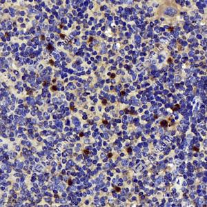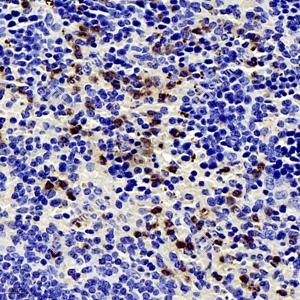 | IHC检测NK-p44蛋白(货号 GB11616). 样品: 小鼠免疫脾, 4%多聚甲醛 (货号G1101) 固定12-24小时. 抗原修复: 柠檬酸抗原修复液(干粉, pH 6.0) (G1201), 98℃, 20分钟. —抗: 1: 500稀释, 4℃ 孵育过夜. 二抗: HRP标记山羊抗兔IgG (H+L) (货号GB23303), 1: 200稀释, 室温孵育1小时. |