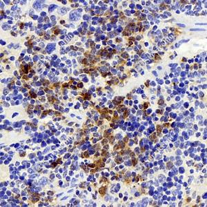 IHC检测NK-p44蛋白(货号 GB11615). 样品: 小鼠脾, 4%多聚甲醛 (货号G1101) 固定12-24小时. 抗原修复: 柠檬酸抗原修复液(干粉, pH 6.0) (G1201), 98℃, 20分钟. —抗: 1: 500稀释, 4℃ 孵育过夜. 二抗: HRP标记山羊抗兔IgG (H+L) (货号GB23303), 1: 200稀释, 室温孵育1小时. |