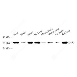 WB检测DcR3蛋白(货号 GB112102). 样品: 经RIPA裂解液(货号G2002)处理的蛋白质. 封闭: 3%脱脂牛奶(货号GC310001)溶于TBST溶液, 室温孵育1小时. —抗: 1: 500稀释, 4℃ 孵育过夜. 二抗: HRP标记山羊抗兔IgG (H+L) (货号GB23303), 1: 5000稀释, 室温孵育1小时. |