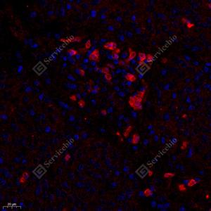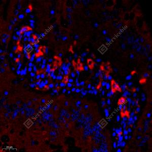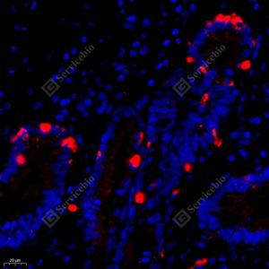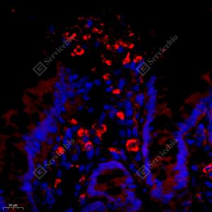 IF检测DcR3蛋白(货号 GB112102)(红色). 样品: 大鼠小肠, 4%多聚甲醛 (货号G1101) 固定12-24小时. 抗原修复: Tris-EDTA抗原修复液(pH 9.0) (G1203), 98℃, 20分钟. 封闭: 3% BSA(货号GC305010)的PBS溶液, 室温孵育30分钟. —抗: 1: 700稀释, 4℃ 孵育过夜. 二抗: Cy3标记山羊抗兔IgG (H+L) (货号GB21303), 1: 300稀释, 室温孵育1小时. |