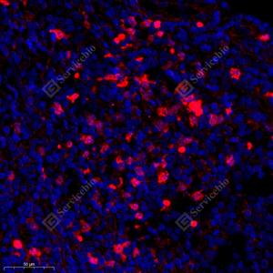 IF检测DcR3蛋白(货号 GB112102)(红色). 样品: 人扁桃体, 4%多聚甲醛 (货号G1101) 固定12-24小时. 抗原修复: Tris-EDTA抗原修复液(pH 9.0) (G1203), 98℃, 20分钟. 封闭: 3% BSA(货号GC305010)的PBS溶液, 室温孵育30分钟. —抗: 1: 700稀释, 4℃ 孵育过夜. 二抗: Cy3标记山羊抗兔IgG (H+L) (货号GB21303), 1: 300稀释, 室温孵育1小时. |
