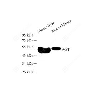 WB检测Angiotensinogen蛋白(货号 GB11535). 样品: 经RIPA裂解液(货号G2002)处理的蛋白质. 封闭: 封闭: 3%脱脂牛奶(货号GC310001)溶于TBST溶液, 室温孵育1小时. —抗: 1: 500稀释, 4℃ 孵育过夜. 二抗: HRP标记山羊抗兔IgG (H+L) (货号GB23303), 1: 5000稀释, 室温孵育1小时. |