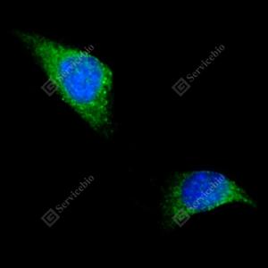 ICC检测DCI蛋白(货号 GB113086)(绿色). 样品: NIH-3T3细胞, 4%多聚甲醛 (货号G1101) 固定20分钟. 封闭: 3% BSA(货号GC305010)的PBS溶液, 室温孵育30分钟. 一抗: 1: 50稀释, 4℃ 孵育过夜. 二抗: Alexa Fluor 488标记山羊抗兔IgG (H+L) (货号GB25303), 1: 400稀释, 室温孵育1小时. |