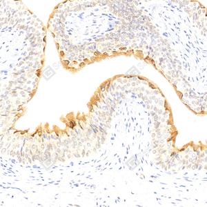 IHC检测LCAT蛋白(货号 GB113818). 样品: 大鼠膀胱, 4%多聚甲醛 (货号G1101) 固定12-24小时. 抗原修复: 柠檬酸抗原修复液(干粉, pH 6.0) (G1201), 98℃, 20分钟. —抗: 1: 1000稀释, 4℃ 孵育过夜. 二抗: HRP标记山羊抗兔IgG (H+L) (货号GB23303), 1: 200稀释, 室温孵育1小时. |