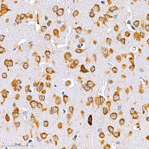 IHC检测LCAT蛋白(货号 GB111159). 样品: 小鼠脑, 4%多聚甲醛 (货号G1101) 固定12-24小时. 抗原修复: 柠檬酸抗原修复液(干粉, pH 6.0) (G1201), 98℃, 20分钟. —抗: 1: 900稀释, 4℃ 孵育过夜. 二抗: HRP标记山羊抗兔IgG (H+L) (货号GB23303), 1: 200稀释, 室温孵育1小时. |