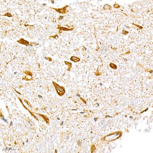 IHC检测LCAT蛋白(货号 GB111159). 样品: 大鼠脊髓, 4%多聚甲醛 (货号G1101) 固定12-24小时. 抗原修复: 柠檬酸抗原修复液(干粉, pH 6.0) (G1201), 98℃, 20分钟. —抗: 1: 900稀释, 4℃ 孵育过夜. 二抗: HRP标记山羊抗兔IgG (H+L) (货号GB23303), 1: 200稀释, 室温孵育1小时. |