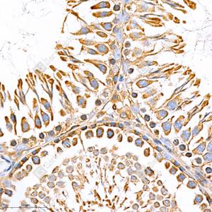 IHC检测LCAT蛋白(货号 GB111159). 样品: 大鼠睾丸, 4%多聚甲醛 (货号G1101) 固定12-24小时. 抗原修复: 柠檬酸抗原修复液(干粉, pH 6.0) (G1201), 98℃, 20分钟. —抗: 1: 900稀释, 4℃ 孵育过夜. 二抗: HRP标记山羊抗兔IgG (H+L) (货号GB23303), 1: 200稀释, 室温孵育1小时. |