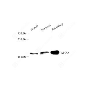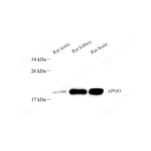 WB检测Apolipoprotein O蛋白(货号 GB113894). 样品: 经RIPA裂解液(货号G2002)处理的蛋白质. 封闭: 封闭: 3%脱脂牛奶(货号GC310001)溶于TBST溶液, 室温孵育1小时. —抗: 1: 1000稀释, 4℃ 孵育过夜. 二抗: HRP标记山羊抗兔IgG (H+L) (货号GB23303), 1: 5000稀释, 室温孵育1小时. |