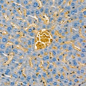| IHC检测Apolipoprotein CIII蛋白(货号 GB112005). 样品: 小鼠肝, 4%多聚甲醛 (货号G1101) 固定12-24小时. 抗原修复: 柠檬酸抗原修复液(干粉, pH 6.0) (G1201), 98℃, 20分钟. —抗: 1: 300稀释, 4℃ 孵育过夜. 二抗: HRP标记山羊抗兔IgG (H+L) (货号GB23303), 1: 200稀释, 室温孵育1小时. |
