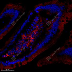 | IF检测Apolipoprotein CIII蛋白(货号 GB112005)(红色). 样品: 小鼠十二指肠, 4%多聚甲醛 (货号G1101) 固定12-24小时. 抗原修复: Tris-EDTA抗原修复液(pH 9.0) (G1203), 98℃, 20分钟. 封闭: 3% BSA(货号GC305010)的PBS溶液, 室温孵育30分钟. —抗: 1: 650稀释, 4℃ 孵育过夜. 二抗: Cy3标记山羊抗兔IgG (H+L) (货号GB21303), 1: 300稀释, 室温孵育1小时. |