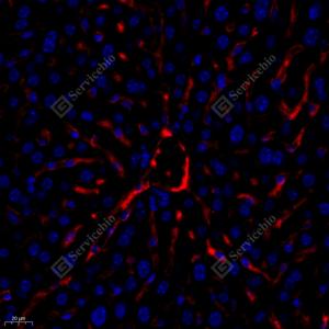 | IF检测Apolipoprotein CIII蛋白(货号 GB112005)(红色). 样品: 小鼠肝, 4%多聚甲醛 (货号G1101) 固定12-24小时. 抗原修复: Tris-EDTA抗原修复液(pH 9.0) (G1203), 98℃, 20分钟. 封闭: 3% BSA(货号GC305010)的PBS溶液, 室温孵育30分钟. —抗: 1: 650稀释, 4℃ 孵育过夜. 二抗: Cy3标记山羊抗兔IgG (H+L) (货号GB21303), 1: 300稀释, 室温孵育1小时. |
