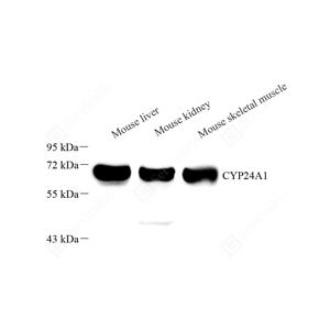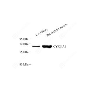 WB检测CYP24A1蛋白(货号 GB113873). 样品: 经RIPA裂解液(货号G2002)处理的蛋白质. 封闭: 封闭: 3%脱脂牛奶(货号GC310001)溶于TBST溶液, 室温孵育1小时. —抗: 1: 3000稀释, 4℃ 孵育过夜. 二抗: HRP标记山羊抗兔IgG (H+L) (货号GB23303), 1: 5000稀释, 室温孵育1小时. |