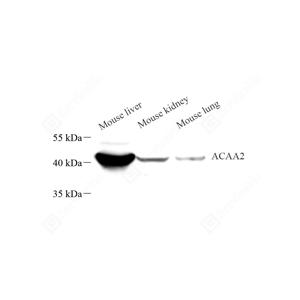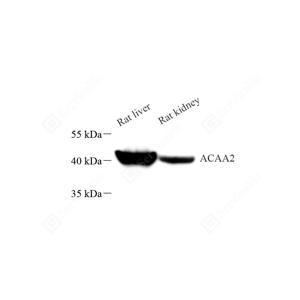 WB检测ACAA2蛋白(货号 GB114720). 样品: 经RIPA裂解液(货号G2002)处理的蛋白质. 封闭: 封闭: 3%脱脂牛奶(货号GC310001)溶于TBST溶液, 室温孵育1小时. —抗: 1: 1500稀释, 4℃ 孵育过夜. 二抗: HRP标记山羊抗兔IgG (H+L) (货号GB23303), 1: 5000稀释, 室温孵育1小时. |