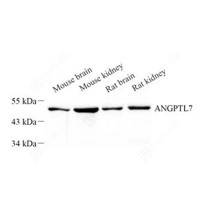 WB检测ANGPTL7蛋白(货号 GB112491). 样品: 经RIPA裂解液(货号G2002)处理的蛋白质. 封闭: 封闭: 3%脱脂牛奶(货号GC310001)溶于TBST溶液, 室温孵育1小时. —抗: 1: 500稀释, 4℃ 孵育过夜. 二抗: HRP标记山羊抗兔IgG (H+L) (货号GB23303), 1: 5000稀释, 室温孵育1小时. |