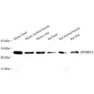 APOBEC2 is a 224 amino acid protein that belongs to the cytidine and deoxycytidylate deaminase family. Expressed exclusively in heart and skeletal muscle, APOBEC2 is thought to be a probable C (cytidine) to U (uridine) editing enzyme. However, unlike other members of the family, such as APOBEC1, which mediates the editing of apolipoprotein (apo) B mRNA, APOBEC2 does not display any detectable apoB mRNA editing activity. Also, APOBEC2 has been shown to have low, but definite, intrinsic cytidine deaminase activity.