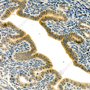 IHC检测mSin3A蛋白(货号 GB11968). 样品: 小鼠子宫, 4%多聚甲醛 (货号G1101) 固定12-24小时. 抗原修复: 柠檬酸抗原修复液(干粉, pH 6.0) (G1201), 98℃, 20分钟. —抗: 1: 100稀释, 4℃ 孵育过夜. 二抗: HRP标记山羊抗兔IgG (H+L) (货号GB23303), 1: 200稀释, 室温孵育1小时. |