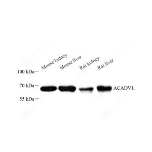 WB检测ACADVL/VLCAD蛋白(货号 GB114309). 样品: 经RIPA裂解液(货号G2002)处理的蛋白质. 封闭: 封闭: 3%脱脂牛奶(货号GC310001)溶于TBST溶液, 室温孵育1小时. —抗: 1: 1000稀释, 4℃ 孵育过夜. 二抗: HRP标记山羊抗兔IgG (H+L) (货号GB23303), 1: 5000稀释, 室温孵育1小时. |