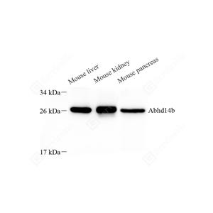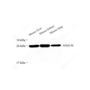 WB检测ABHD14B蛋白(货号 GB113270). 样品: 经RIPA裂解液(货号G2002)处理的蛋白质. 封闭: 封闭: 3%脱脂牛奶(货号GC310001)溶于TBST溶液, 室温孵育1小时. —抗: 1: 1400稀释, 4℃ 孵育过夜. 二抗: HRP标记山羊抗兔IgG (H+L) (货号GB23303), 1: 5000稀释, 室温孵育1小时. |