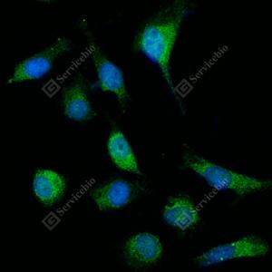 ICC检测Acyl-CoA Thioesterase 9蛋白(货号 GB113522)(绿色). 样品: NIH-3T3细胞, 4%多聚甲醛 (货号G1101) 固定20分钟. 封闭: 3% BSA(货号GC305010)的PBS溶液, 室温孵育30分钟. —抗: 1: 50稀释, 4℃ 孵育过夜. 二抗: Alexa Fluor 488标记山羊抗兔IgG (H+L) (货号GB25303), 1: 400稀释, 室温孵育1小时. |