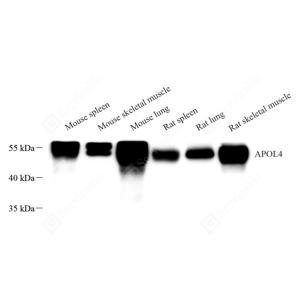 WB检测APOL4蛋白(货号 GB114567). 样品: 经RIPA裂解液(货号G2002)处理的蛋白质. 封闭: 封闭: 3%脱脂牛奶(货号GC310001)溶于TBST溶液, 室温孵育1小时. —抗: 1: 1000稀释, 4℃ 孵育过夜. 二抗: HRP标记山羊抗兔IgG (H+L) (货号GB23303), 1: 5000稀释, 室温孵育1小时. |