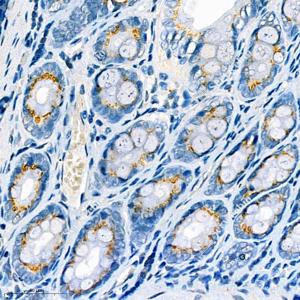 IHC检测CYP2W1蛋白(货号 GB111953). 样品: 大鼠回肠, 4%多聚甲醛 (货号G1101) 固定12-24小时. 抗原修复: 柠檬酸抗原修复液(干粉, pH 6.0) (G1201), 98℃, 20分钟. —抗: 1: 500稀释, 4℃ 孵育过夜. 二抗: HRP标记山羊抗兔IgG (H+L) (货号GB23303), 1: 200稀释, 室温孵育1小时. |