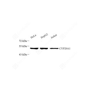 WB检测CYP20A1蛋白(货号 GB112287). 样品: 经RIPA裂解液(货号G2002)处理的蛋白质. 封闭: 3%脱脂牛奶(货号GC310001)溶于TBST溶液, 室温孵育1小时. —抗: 1: 250稀释, 4℃ 孵育过夜. 二抗: HRP标记山羊抗兔IgG (H+L) (货号GB23303), 1: 5000稀释, 室温孵育1小时. |