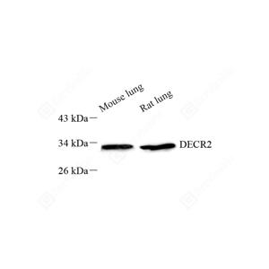 WB检测DECR2/PDCR蛋白(货号 GB113123). 样品: 经RIPA裂解液(货号G2002)处理的蛋白质. 封闭: 3%脱脂牛奶(货号GC310001)溶于TBST溶液, 室温孵育1小时. —抗: 1: 2000稀释, 4℃ 孵育过夜. 二抗: HRP标记山羊抗兔IgG (H+L) (货号GB23303), 1: 5000稀释, 室温孵育1小时. |