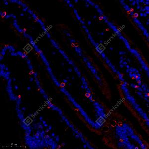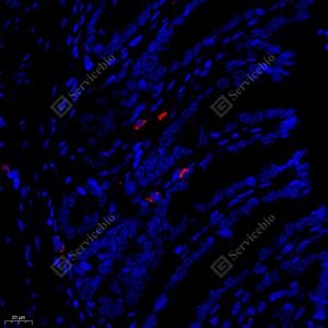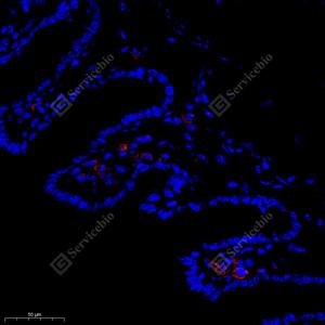 IF检测FAM135B蛋白(货号 GB112039)(红色). 样品: 小鼠十二指肠, 4%多聚甲醛 (货号G1101) 固定12-24小时. 抗原修复: Tris-EDTA抗原修复液(pH 9.0) (G1203), 98℃, 20分钟. 封闭: 3% BSA(货号GC305010)的PBS溶液, 室温孵育30分钟. —抗: 1: 600稀释, 4℃ 孵育过夜. 二抗: Cy3标记山羊抗兔IgG (H+L) (货号GB21303), 1: 300稀释, 室温孵育1小时. |