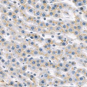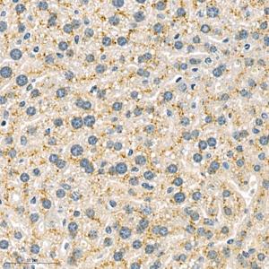 IHC检测GM2A蛋白(货号 GB112121). 样品: 小鼠肝, 4%多聚甲醛 (货号G1101) 固定12-24小时. 抗原修复: 柠檬酸抗原修复液(干粉, pH 6.0) (G1201), 98℃, 20分钟. —抗: 1: 1000稀释, 4℃ 孵育过夜. 二抗: HRP标记山羊抗兔IgG (H+L) (货号GB23303), 1: 200稀释, 室温孵育1小时. |