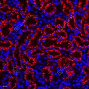 IF检测GM2A蛋白(货号 GB112121)(红色). 样品: 小鼠肾, 4%多聚甲醛 (货号G1101) 固定12-24小时. 抗原修复: Tris-EDTA抗原修复液(pH 9.0) (G1203), 98℃, 20分钟. 封闭: 3% BSA(货号GC305010)的PBS溶液, 室温孵育30分钟. —抗: 1: 1000稀释, 4℃ 孵育过夜. 二抗: Cy3标记山羊抗兔IgG (H+L) (货号GB21303), 1: 300稀释, 室温孵育1小时. |