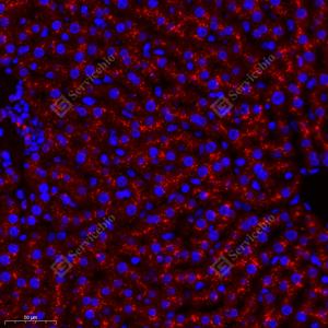 IF检测GM2A蛋白(货号 GB112121)(红色). 样品: 大鼠肝, 4%多聚甲醛 (货号G1101) 固定12-24小时. 抗原修复: Tris-EDTA抗原修复液(pH 9.0) (G1203), 98℃, 20分钟. 封闭: 3% BSA(货号GC305010)的PBS溶液, 室温孵育30分钟. —抗: 1: 1000稀释, 4℃ 孵育过夜. 二抗: Cy3标记山羊抗兔IgG (H+L) (货号GB21303), 1: 300稀释, 室温孵育1小时. |