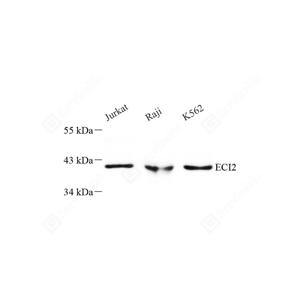 WB检测PECI/ECI2蛋白(货号 GB112281). 样品: 经RIPA裂解液(货号G2002)处理的蛋白质. 封闭: 封闭: 3%脱脂牛奶(货号GC310001)溶于TBST溶液, 室温孵育1小时. —抗: 1: 500稀释, 4℃ 孵育过夜. 二抗: HRP标记山羊抗兔IgG (H+L) (货号GB23303), 1: 5000稀释, 室温孵育1小时. |