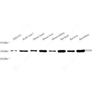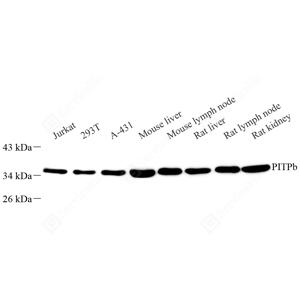 WB检测PITPNB蛋白(货号 GB112154). 样品: 经RIPA裂解液(货号G2002)处理的蛋白质. 封闭: 封闭: 3%脱脂牛奶(货号GC310001)溶于TBST溶液, 室温孵育1小时. —抗: 1: 500稀释, 4℃ 孵育过夜. 二抗: HRP标记山羊抗兔IgG (H+L) (货号GB23303), 1: 5000稀释, 室温孵育1小时. |