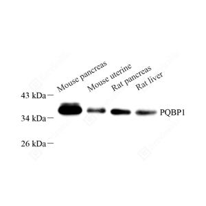 WB检测PQBP1蛋白(货号 GB113464). 样品: 经RIPA裂解液(货号G2002)处理的蛋白质. 封闭: 3%脱脂牛奶(货号GC310001)溶于TBST溶液, 室温孵育1小时. —抗: 1: 1000稀释, 4℃ 孵育过夜. 二抗: HRP标记山羊抗兔IgG (H+L) (货号GB23303), 1: 5000稀释, 室温孵育1小时. |