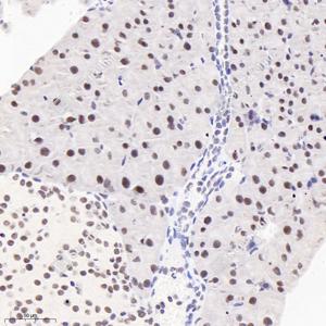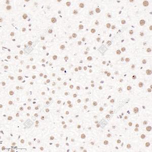 IHC检测PQBP1蛋白(货号 GB113464). 样品: 小鼠肝, 4%多聚甲醛 (货号G1101) 固定12-24小时. 抗原修复: 柠檬酸抗原修复液(干粉, pH 6.0) (G1201), 98℃, 20分钟. —抗: 1: 4000稀释, 4℃ 孵育过夜. 二抗: HRP标记山羊抗兔IgG (H+L) (货号GB23303), 1: 200稀释, 室温孵育1小时. |