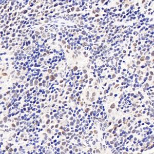 IHC检测PQBP1蛋白(货号 GB113464). 样品: 小鼠脾, 4%多聚甲醛 (货号G1101) 固定12-24小时. 抗原修复: 柠檬酸抗原修复液(干粉, pH 6.0) (G1201), 98℃, 20分钟. —抗: 1: 4000稀释, 4℃ 孵育过夜. 二抗: HRP标记山羊抗兔IgG (H+L) (货号GB23303), 1: 200稀释, 室温孵育1小时. |
