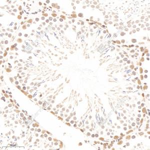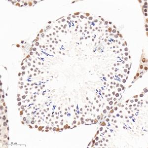 IHC检测PQBP1蛋白(货号 GB113464). 样品: 小鼠睾丸, 4%多聚甲醛 (货号G1101) 固定12-24小时. 抗原修复: 柠檬酸抗原修复液(干粉, pH 6.0) (G1201), 98℃, 20分钟. —抗: 1: 4000稀释, 4℃ 孵育过夜. 二抗: HRP标记山羊抗兔IgG (H+L) (货号GB23303), 1: 200稀释, 室温孵育1小时. |