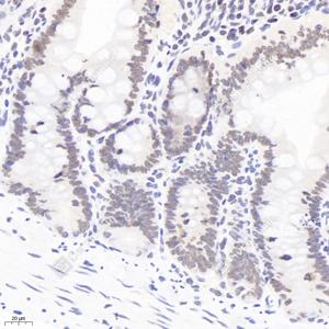 IHC检测PQBP1蛋白(货号 GB113464). 样品: 大鼠结肠, 4%多聚甲醛 (货号G1101) 固定12-24小时. 抗原修复: 柠檬酸抗原修复液(干粉, pH 6.0) (G1201), 98℃, 20分钟. —抗: 1: 4000稀释, 4℃ 孵育过夜. 二抗: HRP标记山羊抗兔IgG (H+L) (货号GB23303), 1: 200稀释, 室温孵育1小时. |