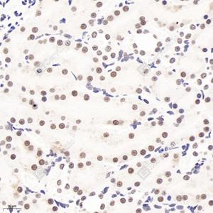 IHC检测PQBP1蛋白(货号 GB113464). 样品: 大鼠肾, 4%多聚甲醛 (货号G1101) 固定12-24小时. 抗原修复: 柠檬酸抗原修复液(干粉, pH 6.0) (G1201), 98℃, 20分钟. —抗: 1: 4000稀释, 4℃ 孵育过夜. 二抗: HRP标记山羊抗兔IgG (H+L) (货号GB23303), 1: 200稀释, 室温孵育1小时. |