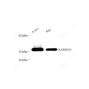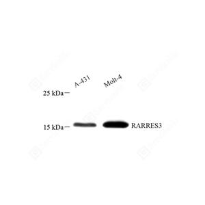 WB检测TIG3蛋白(货号 GB114873). 样品: 经RIPA裂解液(货号G2002)处理的蛋白质. 封闭: 封闭: 3%脱脂牛奶(货号GC310001)溶于TBST溶液, 室温孵育1小时. —抗: 1: 800稀释, 4℃ 孵育过夜. 二抗: HRP标记山羊抗兔IgG (H+L) (货号GB23303), 1: 5000稀释, 室温孵育1小时. |