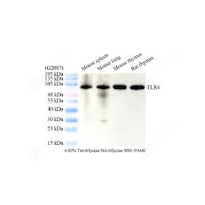 | WB检测TLR4蛋白(货号 ZB11519-HRP). 样品: 经RIPA裂解液(货号G2002)处理的蛋白质. 封闭: 3% BSA(货号GC305010)的PBS溶液, 室温孵育30分钟. 抗体: HRP标记的抗TLR4蛋白抗体 1: 500稀释, 4℃ 孵育过夜. |