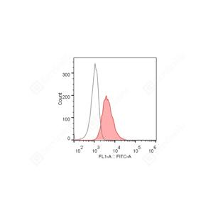 流式细胞术检测CD105表达水平 样本:bend.3细胞 检测抗体:FITC标记抗CD105兔单克隆抗体(货号ZB115656-FITC,红色直方图),1:100稀释,室温避光孵育30分钟 对照抗体:FITC标记山羊抗兔IgG(货号GB22303,开放直方图),1:200稀释,室温避光孵育30分钟 |