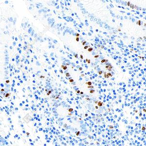 IHC检测Ki67蛋白(货号 GB150023). 样品: 人胃, 4%多聚甲醛 (货号G1101) 固定12-24小时. 抗原修复: 柠檬酸抗原修复液(干粉, pH 6.0) (G1201), 高压锅均匀喷气计时2分钟. —抗: 1: 2000稀释, 4℃ 孵育过夜. 二抗: S-vision免疫组化多聚二抗(山羊抗小鼠), 即用型(货号G1301), 室温孵育20分钟. |
