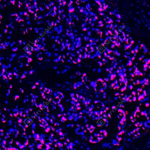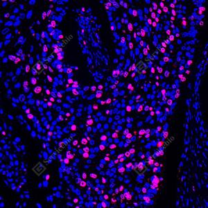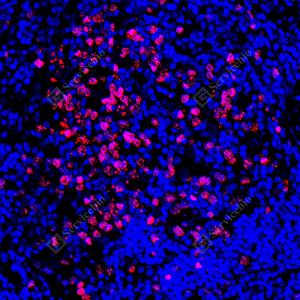 IF检测Ki67蛋白(货号 GB150023)(红色). 样品: 人扁桃体, 4%多聚甲醛 (货号G1101) 固定12-24小时. 抗原修复: 柠檬酸抗原修复液(干粉, pH 6.0) (G1201), 高压锅均匀喷气计时2分钟. 封闭: 3% BSA(货号GC305010)的PBS溶液, 室温孵育30分钟. —抗: 1: 1000稀释, 4℃ 孵育过夜. 二抗: Cy3标记山羊抗小鼠IgG (H+L) (货号GB21301), 1: 300稀释, 室温孵育1小时. |