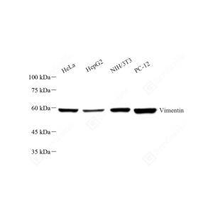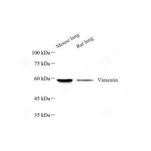 WB检测Vimentin蛋白(货号 GB12192). 样品: 经RIPA裂解液(货号G2002)处理的蛋白质. 封闭: 3%脱脂牛奶(货号GC310001)溶于TBST溶液, 室温孵育1小时. —抗: 1: 1000稀释, 4℃ 孵育过夜. 二抗: HRP标记山羊抗小鼠IgG (H+L) (货号GB23301), 1: 5000稀释, 室温孵育1小时. |