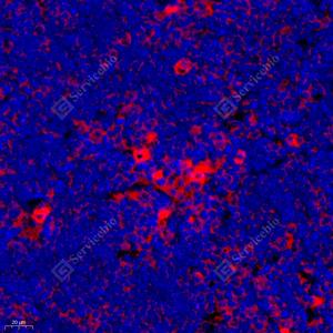 IF检测Vimentin蛋白(货号 GB12192)(红色). 样品: 小鼠胸腺, 4%多聚甲醛 (货号G1101) 固定12-24小时. 抗原修复: 柠檬酸抗原修复液(干粉, pH 6.0) (G1201), 高压锅均匀喷气计时2分钟. 封闭: 3% BSA(货号GC305010)的PBS溶液, 室温孵育30分钟. —抗: 1: 500稀释, 4℃ 孵育过夜. 二抗: Cy3标记山羊抗小鼠IgG (H+L) (货号GB21301), 1: 300稀释, 室温孵育1小时. |